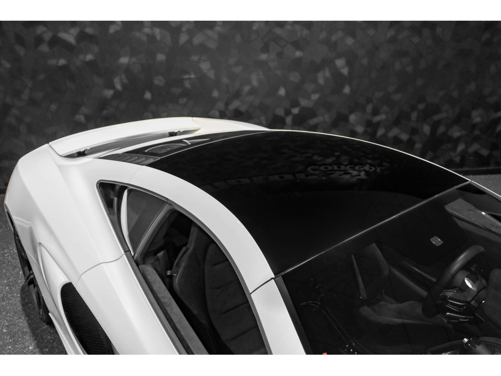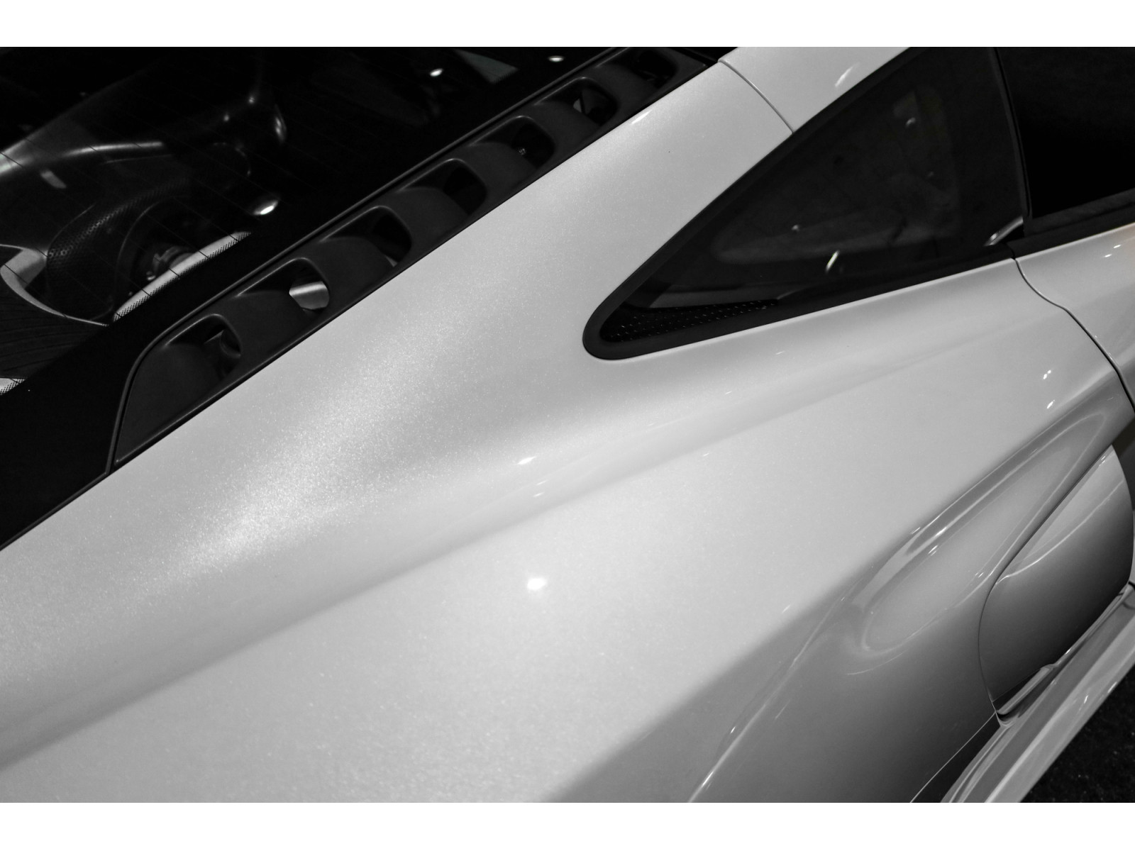 Cette configuration exceptionnelle se manifeste par une livrée Pearl White Metallic sur toutes ses surfaces extérieures, y compris le séparateur avant, les lames de portes et l'intérieur des entrées d'air. En contraste, certains éléments comme le toit, les roues en alliage et les coques de rétroviseurs sont traitées en noir brillant.
